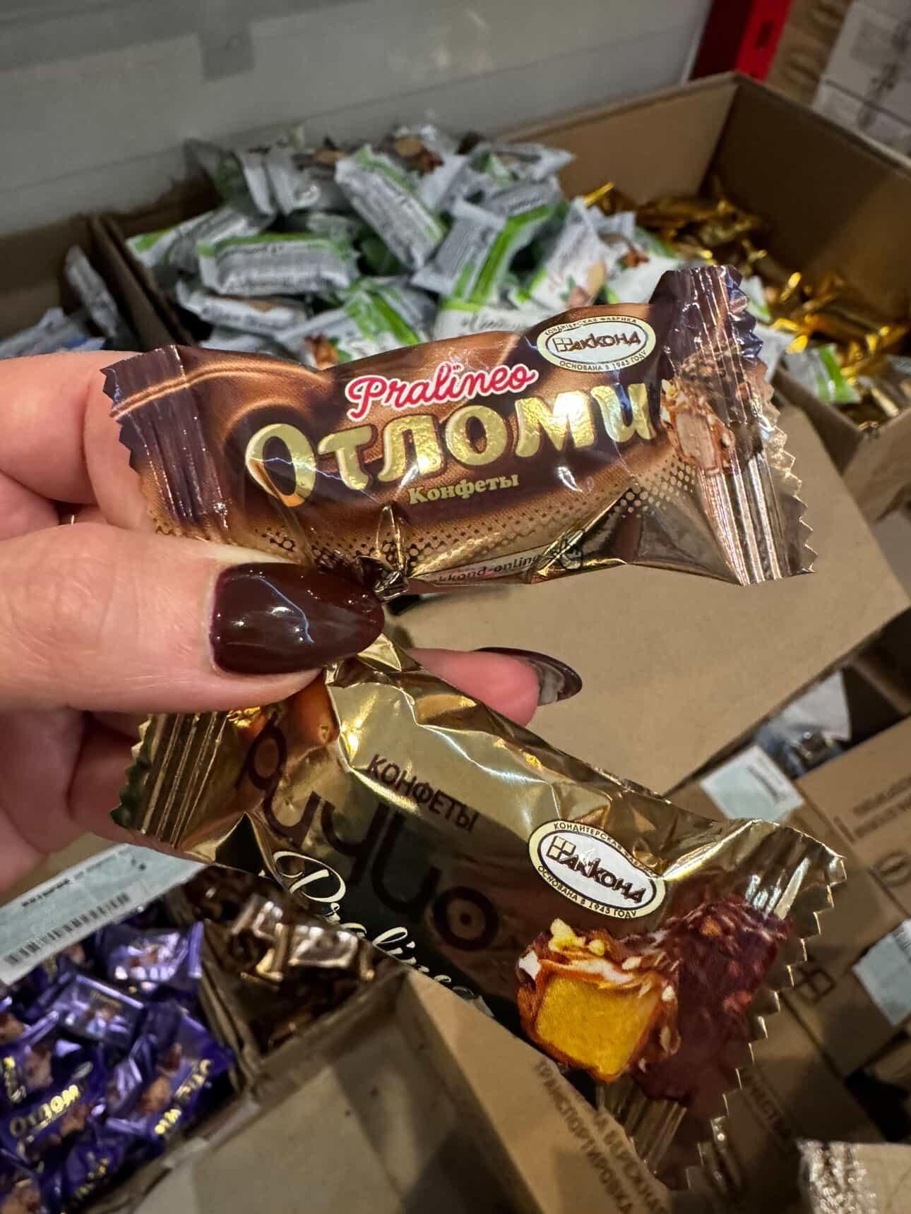 شکلات روسی با مغز بادام زمینی خامه ای rulo praline و مینی ویفر اوتلومی با مغز کرم خامهای و روکش شکلات کارامل آکوند